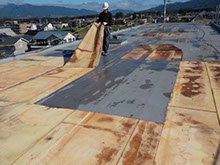 既存防水層は経年劣化や鳥害の影響で、防水層の裏面に水が侵入いる状態でした。